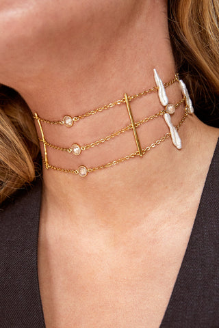 Está compuesto por perlas barrocas, dispuestas de manera alterna y cristales transparentes en engaste biselado que añaden un brillo sutil y elegante.