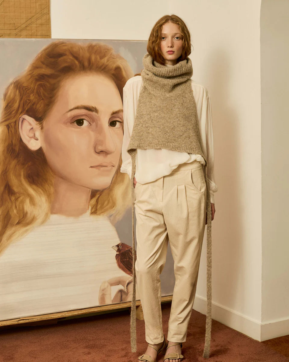 Cuello de lana de cuello alto y cintas para abrochar en torno a la cintura