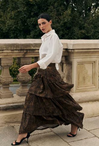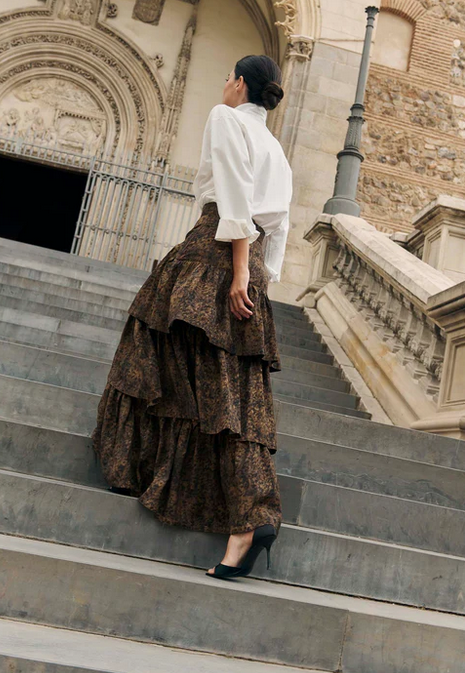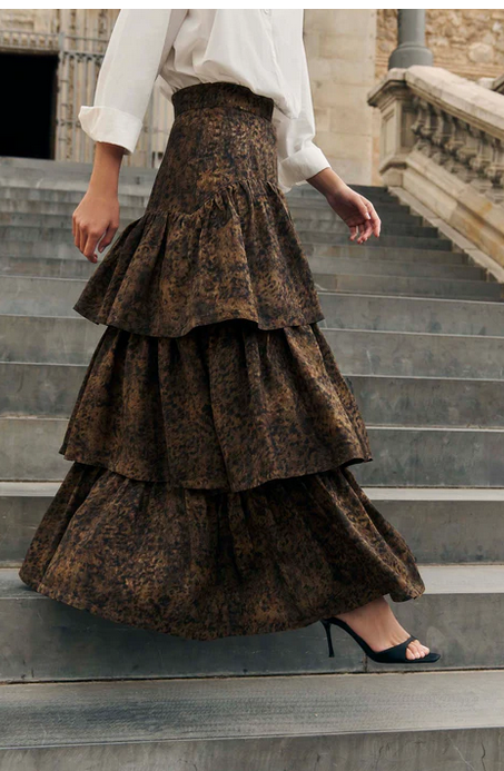 Falda Luisa, confeccionada en suave viscosa, destaca por sus elegantes volantes que aportan frescura y movimiento a tu estilo. Perfecta para cualquier ocasión, combínala con