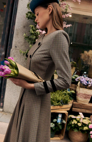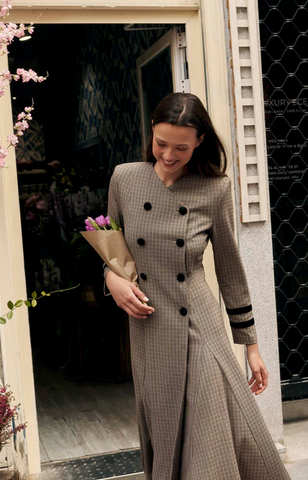 Este vestido de vuelo con botones delanteros y hombreras está diseñado para resaltar tu figura ajustándose a la cintura. Su estilo versátil te permite combinarlo con tacones para eventos de invierno o con botas para un look perfecto en la oficina. Elegancia y comodidad en una sola prenda para cualquier ocasión.