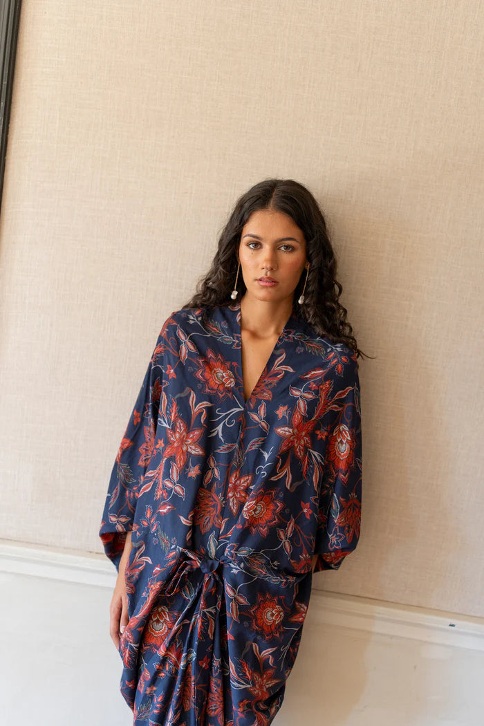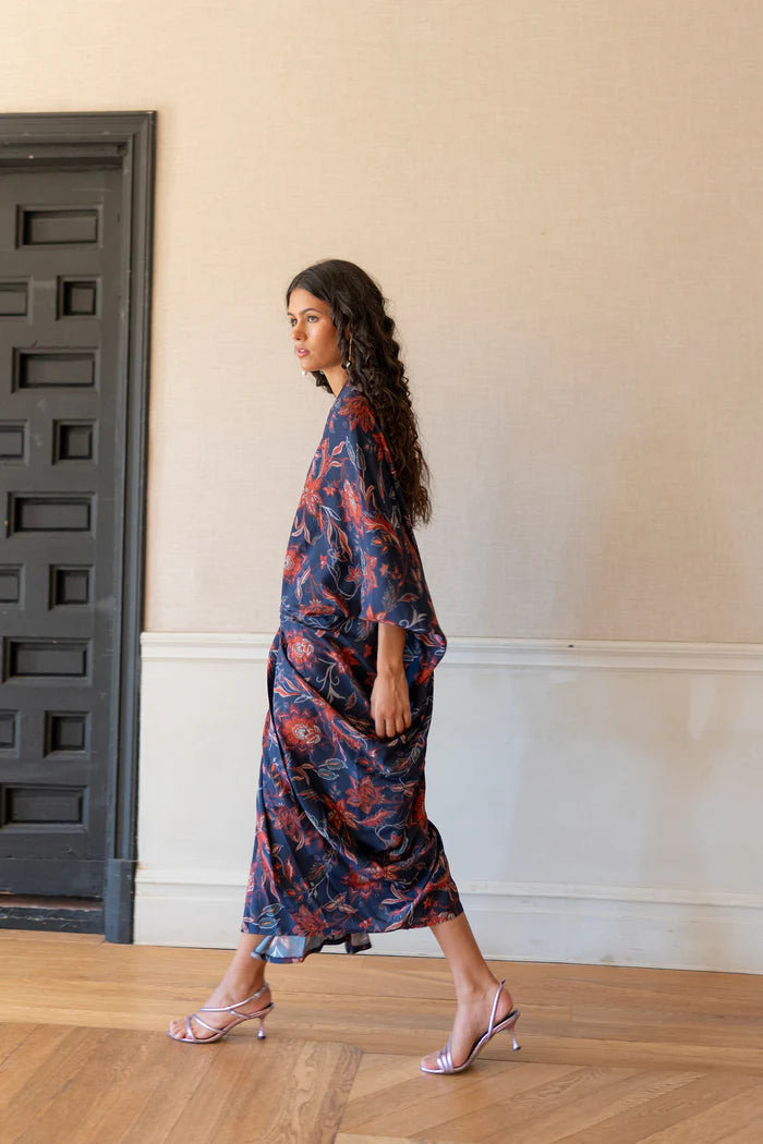 Vestido tipo kaftan, midi con manga murciélago y escote pico, lazada delantera para poder ajustar. Confeccionado en tejido estampado en colores azules, rojos y beige.Este vestido es talla única ya que es muy envolvente y se adapta a varias tallas y cuerpos.