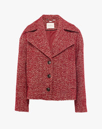 Chaqueta corta de lana con dibujo espiga en tonos rojo y crema. Su silueta cuadrada y tejido suave aportan comodidad y estilo a partes iguales. Perfecta para dar personalidad a looks urbanos o más clásicos. Las solapas amplias, los hombros ligeramente caídos y el cierre de cuatro botones refuerzan su aire entre lo retro y lo contemporáneo.