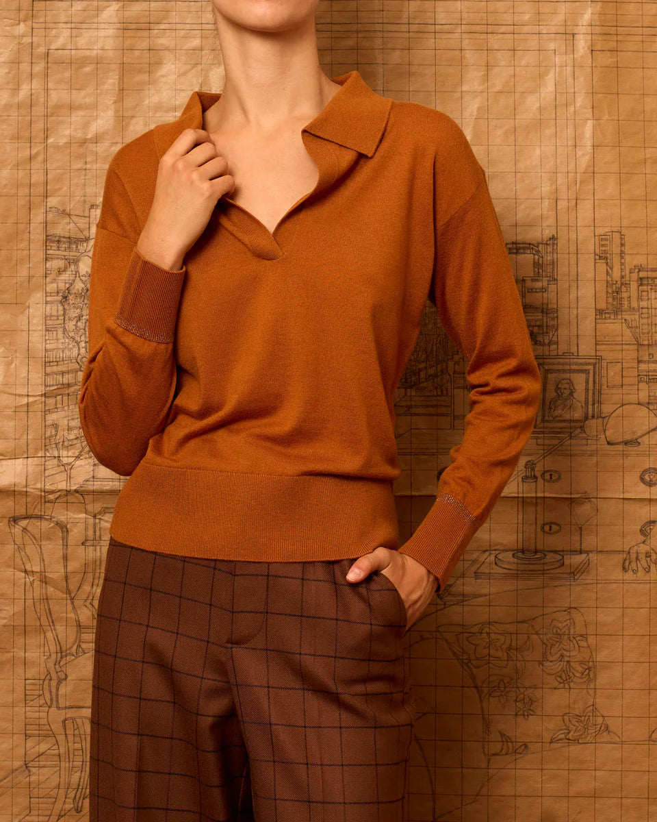 Jersey de punto con cuello solapa y manga larga en color naranja. Tiene detalle de lurex al tono en el inicio del puño